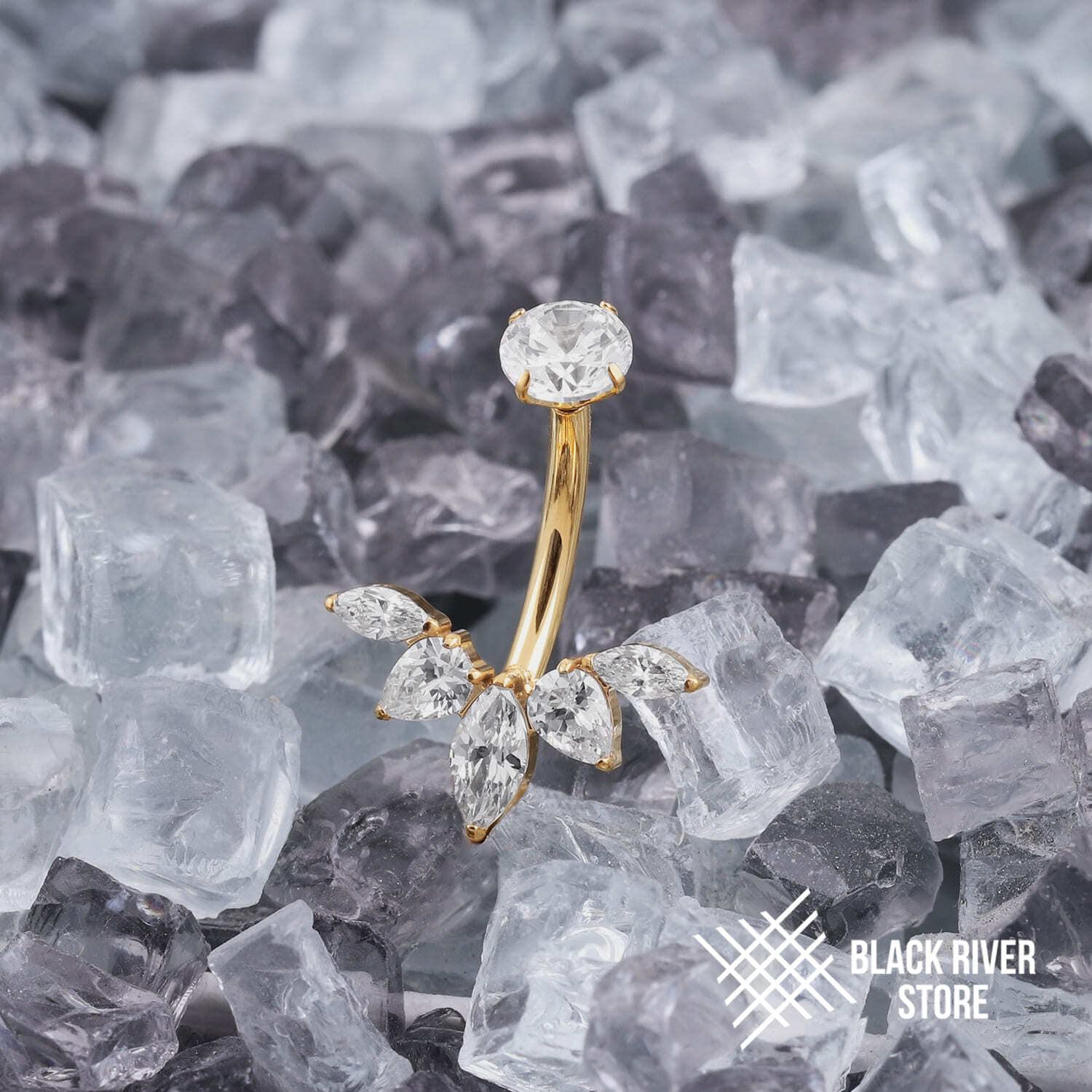 Титановый банан в пупок с прозрачными фианитами и PVD покрытием золотистого цвета (под желтое золото)