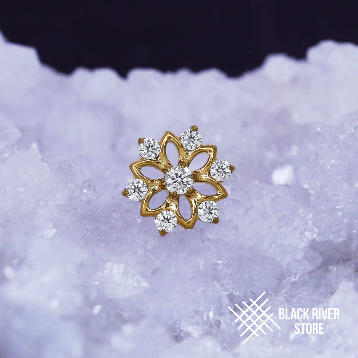 Титановая накрутка в форме цветка с прозрачными фианитами и PVD покрытием золотистого цвета (под желтое золото)